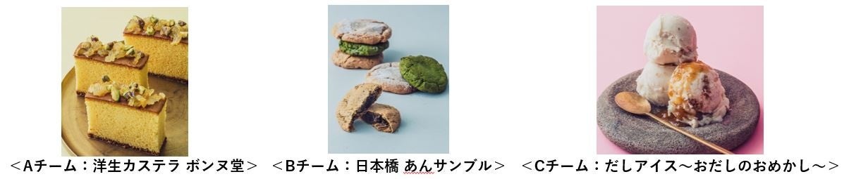 A~Cの3チームに分かれ老舗店の「伝統・技」、新技法で話題のフレンチやヴィーガンに高感度なベイクショップによる「先進性」、日本橋を拠点にするクリエイターによる「アイデア」を組み合わせながら個性を活かすことで、「今の日本橋のストーリーを感じるおみやげ」を3品制作する共創型プロジェクト。老舗の看板商品をフレンチの気鋭シェフが新解釈したカステラ(Aチーム)や、老舗和菓子店がヴィーガンあんこ作りに初挑戦したクッキー(Bチーム)、だしがらを活用するなど、鰹節の新たな魅力を発信するサステナブルなアイスクリーム(Cチーム)といった“お店とお店がつながって”完成した限定メニューが登場します。