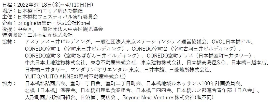 開催場所:江戸桜通り、OVOL日本橋ビル、COREDO室町 1・3・テラス、東京駅八重洲口グランルーフ、東京建物日本橋ビル、日本橋三井タワー、日本橋三越本店、三井本館、YUITO他(予定)