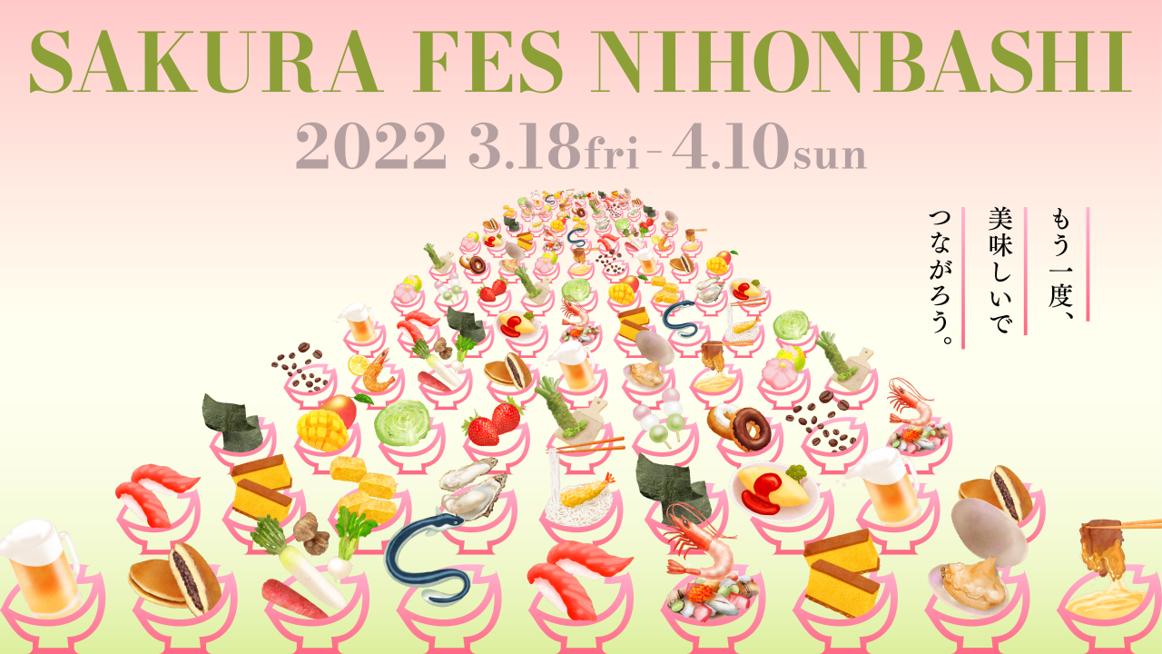 日本橋桜フェスティバル実行委員会は、三井不動産株式会社等の地域の事業者と共に、9回目となる「SAKURA FES NIHONBASHI 2022」を開催いたします。「もう一度、美味しいでつながろう。」をテーマに、日本橋が誇る「食」を通じて、コロナ禍でみつけた、大切な誰かと“つながる”幸せを皆様にお届けします。