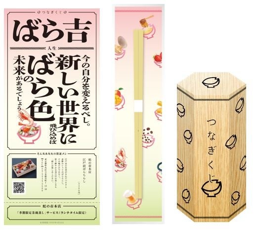 繰り返し使用できるサクラ箸がついた『お箸のおみくじ』。食にまつわるお告げとともに、日本橋の名店メニューが書かれています。老舗の和食店やフレンチレストランなど、15の店舗や施設で使えるお得な特典も付くおみくじで、まだ知らない日本橋のおいしさとつながり合う新しい食体験をお楽しみください。