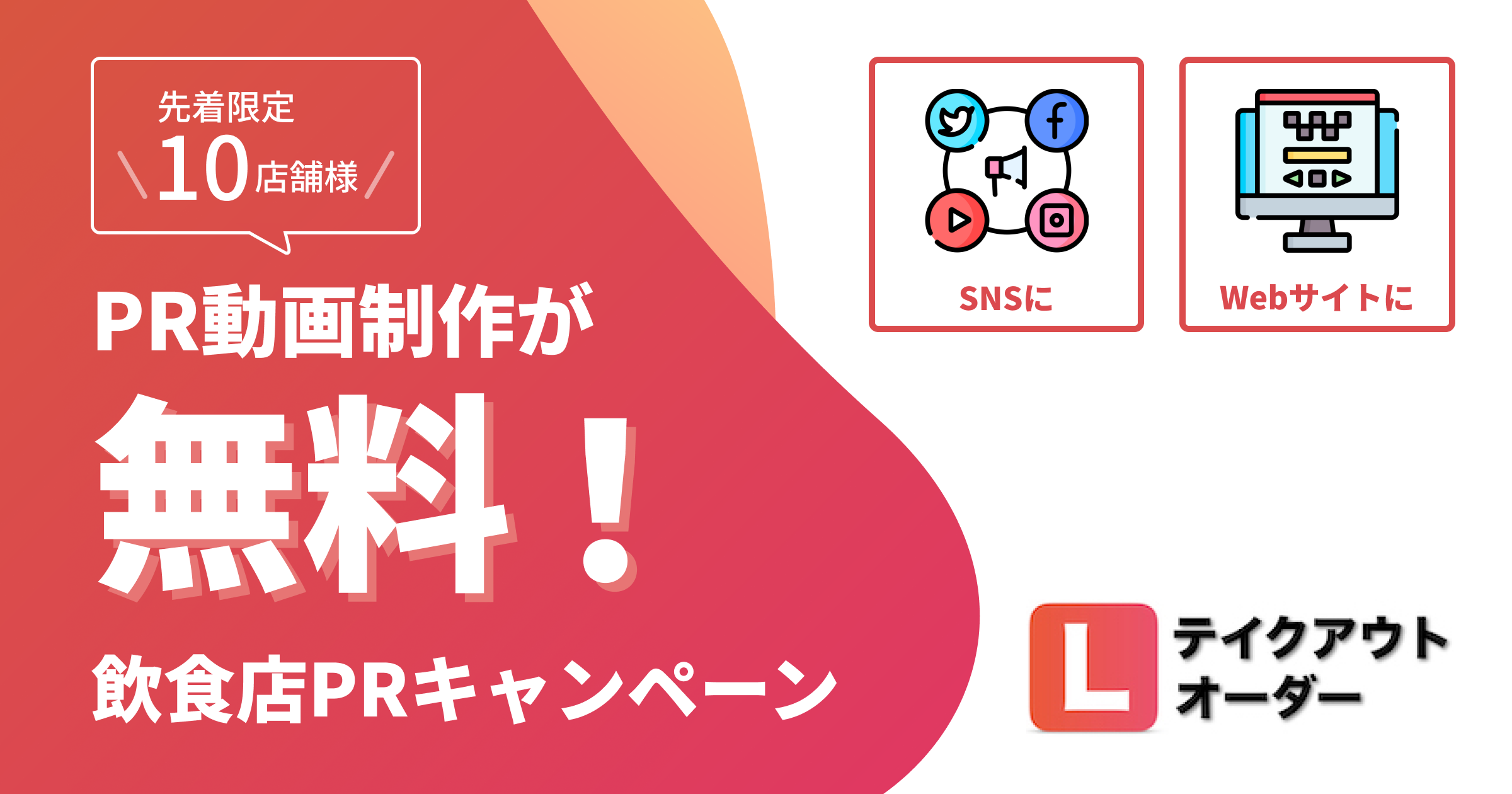 そこで、「Lテイクアウト&オーダー」を新規導入いただいた先着10店舗様に向けて、「店舗の紹介動画」を無料で制作・提供することを決定いたしました。ご提供したPR動画をTwitter・Instagram・YouTubeなどのSNSやWebサイトにそのまま掲載いただくことで、お店の魅力やこだわりの料理をアピールでき、オンライン集客に活用することが可能です。