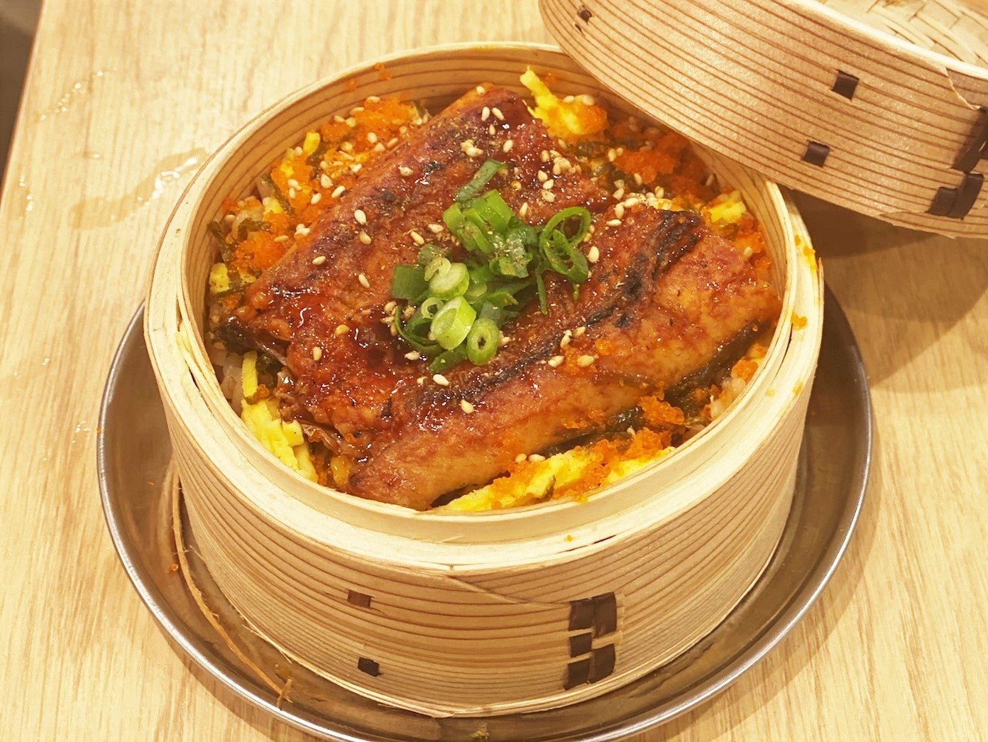 ご飯に蒲焼きのたれとガリを入れて鰻と一緒に蒸しました。ふわふわの鰻を錦糸卵とともに召し上がれ。