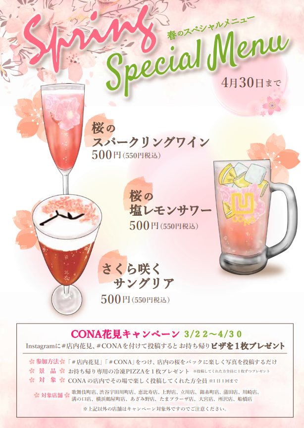 店内窯焼ピッツァをALL500円(税込価格550円)で提供するイタリアンバル『Pizza&Wine CONA』の対象店にて、店内で満開の桜を楽しめる「店内花見」キャンペーンを期間限定3月22日(火)から4月30日(土)まで開催致します。