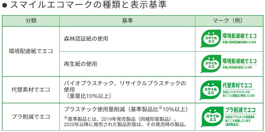 ⁑環境配慮基準をクリアした製品の一部では「スマイルエコマーク」が非表示です。またその製品につきましては、生産の都合上、一時的に基準をクリアする前の製品が流通する場合があります。なお、マークを表示した製品につきましては、全て基準をクリアしております。