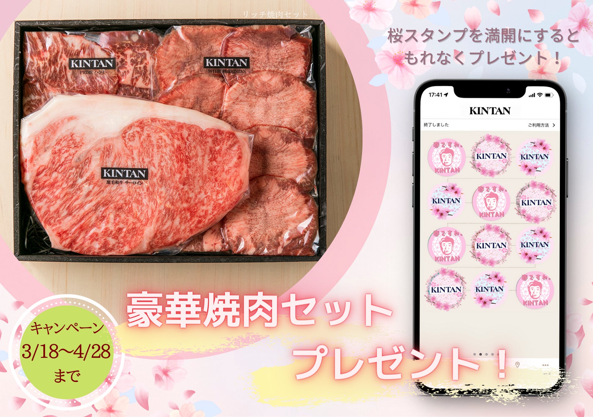 株式会社カルネヴァーレ(本社:東京都目黒区・代表取締役社長 鳴坂竜一)は、KINTAN公式アプリ会員様を対象に “KINTAN春の桜満開キャンペーン”を3月18日(金)~4月28日(木)の期間限定で開催いたします。対象期間中にスタンプカードを桜で満開にできた先着50名様に、【KINTANおうちでリッチ焼肉セット】をプレゼントいたします。