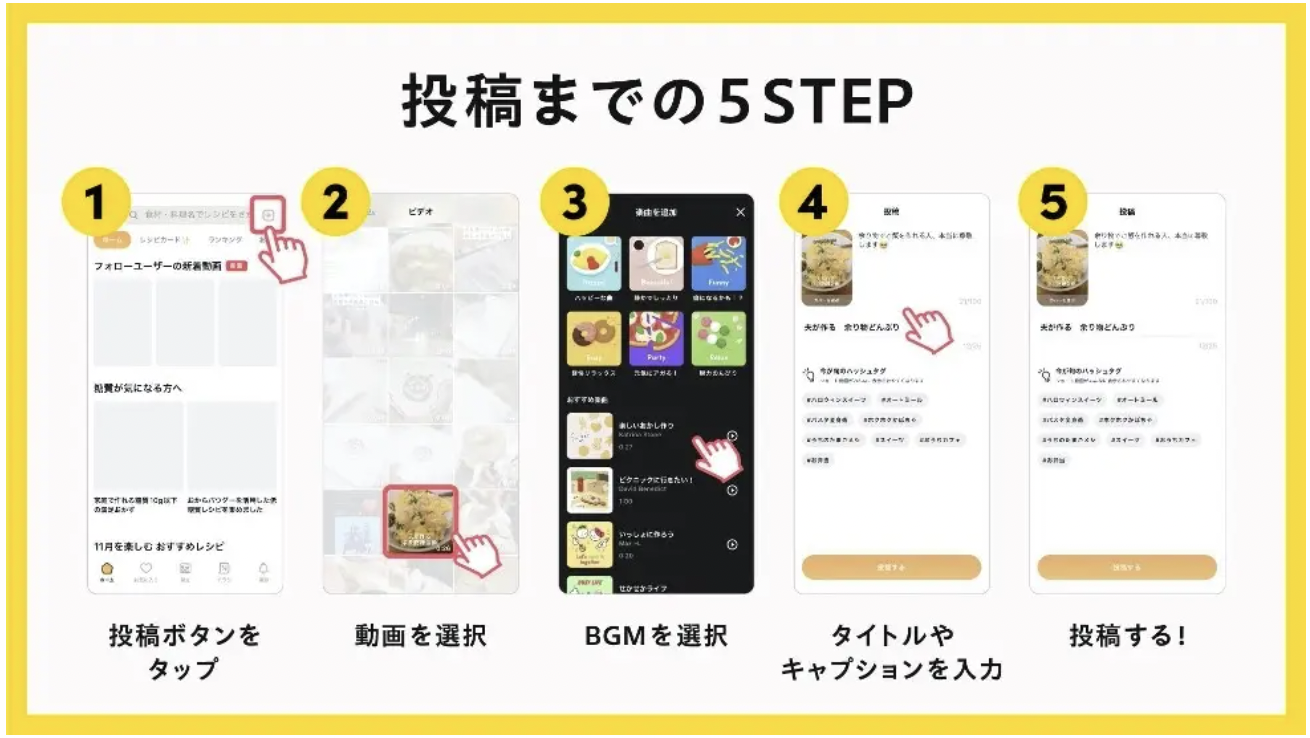 および料理レシピ動画アプリにおける、