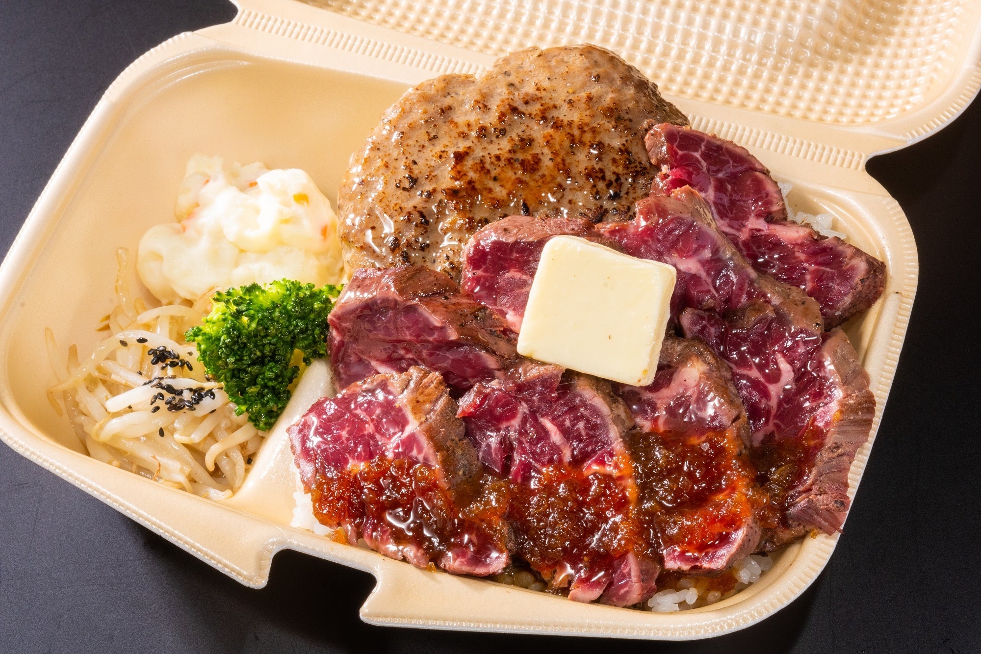 【ステーキ・ハンバーグ・唐揚げ】肉汁溢れる絶品ハンバーグ100gと極上赤身肉のステーキ100gとじゅーしー唐揚げを2個のせた、満腹間違いなしの贅沢な当店だけのボックスです。