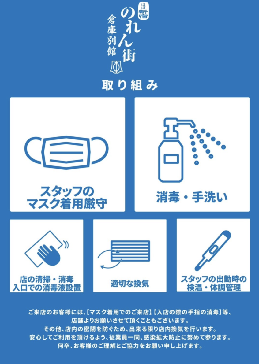 ご来店のお客様には、「マスク着用でのご来店」「入店の際の手指の消毒」等、店舗よりお願いさせて頂くこともございます。その他、店内の密閉を防ぐため、出来る限り店内換気を行います。安心してご利用頂けるよう従業員一同、感染拡大防止に努めて参ります。何卒、お客様のご理解とご協力をお願い申し上げます。