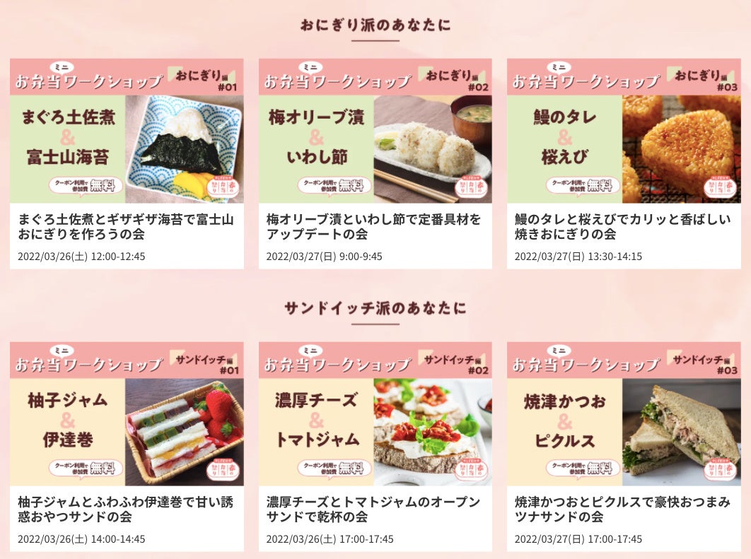 基本的には調理はせず地元食材を使ったおにぎりやサンドイッチを味わいながら地元の作り手の方々とオンラインで交流を行います。2日間で計6回の開催を予定しており、それぞれクーポンを利用すると無料で参加することができます。