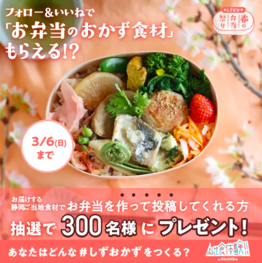 株式会社キッチハイク(本社:東京都台東区、共同代表:山本雅也・藤崎祥見、以下「キッチハイク」)は、静岡県中部5市2町(静岡市、島田市、焼津市、藤枝市、牧之原市、吉田町、川根本町)と共同で、地域産品の認知拡大・販売促進に向けた新しい形の物産展「しずおか春の弁当祭り」を3月26~27日にオンラインで開催いたします。