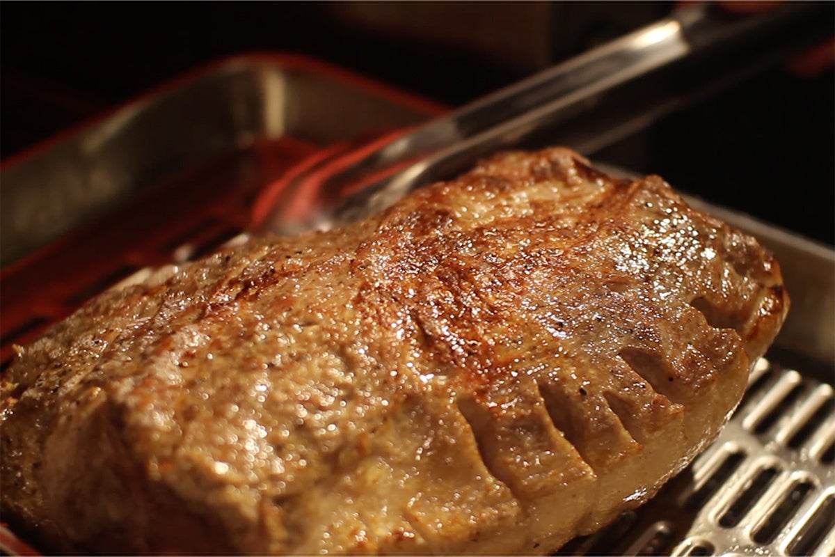 真空低温調理で火を通した豚肉を、仕上げにオーブンでクリスピー状に焼き上げた分厚いポークステーキは、表面の香ばしさが食欲を刺激し、ナイフを入れるとしっかりした肉質ながらもあまりのやわらかさに感動を覚える。