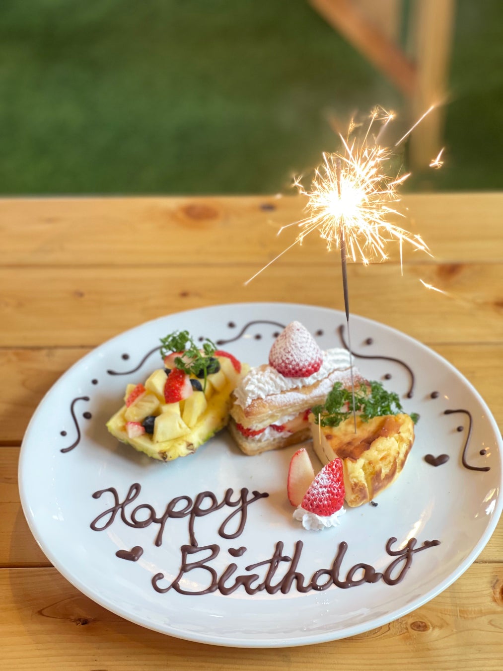 BBQメインなのに「お祝い?サプライズ?」なにをやるの?と疑問をお持ちになると思いますが、当店ではシェフ特製のスイーツ、ケーキやフレッシュな果物を使用した、特製のメッセージ付きデザートプレートのご用意をさせていただいてます。