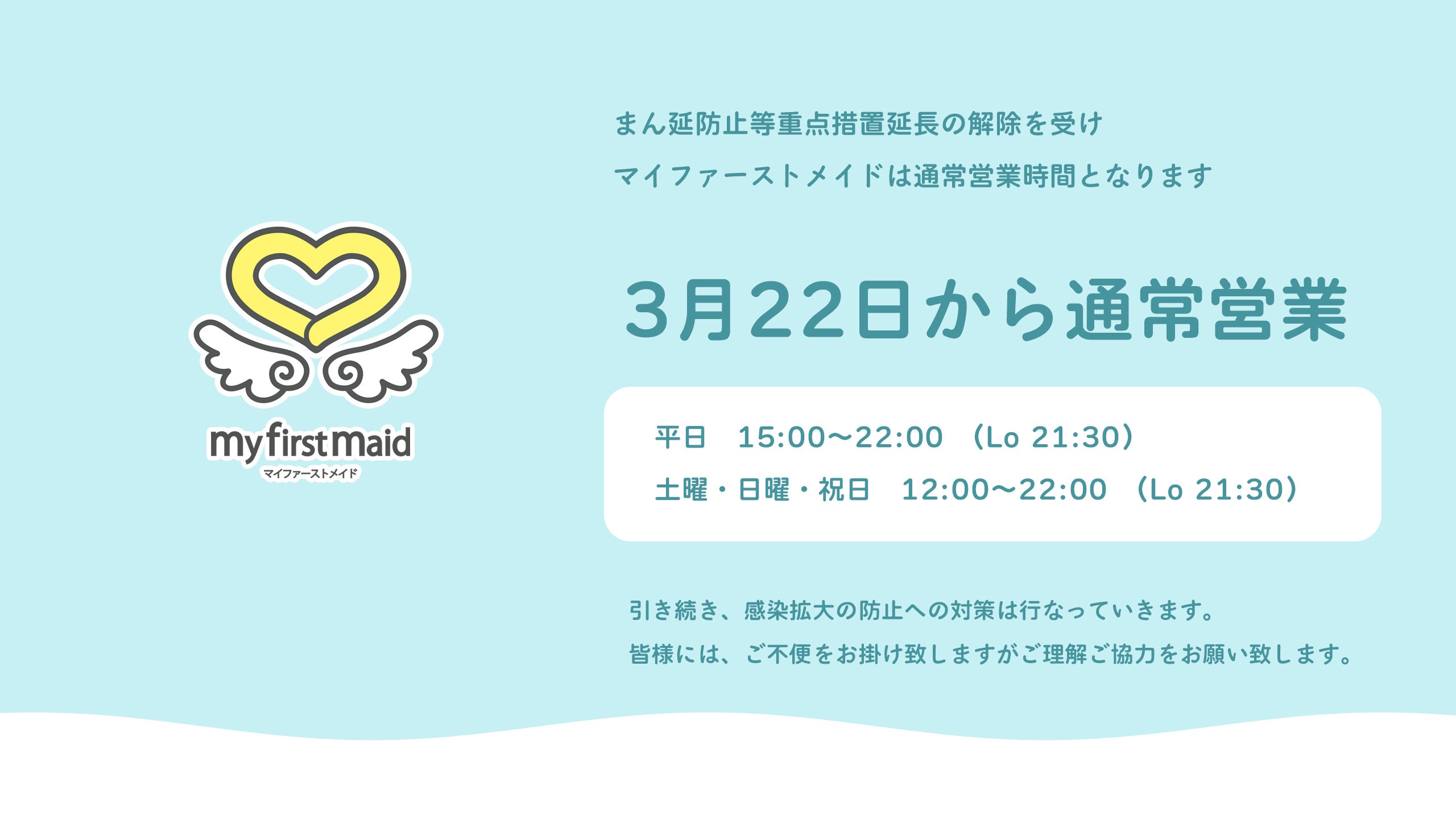 2022年3月22日から秋葉原メイド喫茶(アキバメイドカフェ)マイファーストメイドはまん延防止等重点措置が解除となりましたので、通常営業時間での営業とさせて頂います。