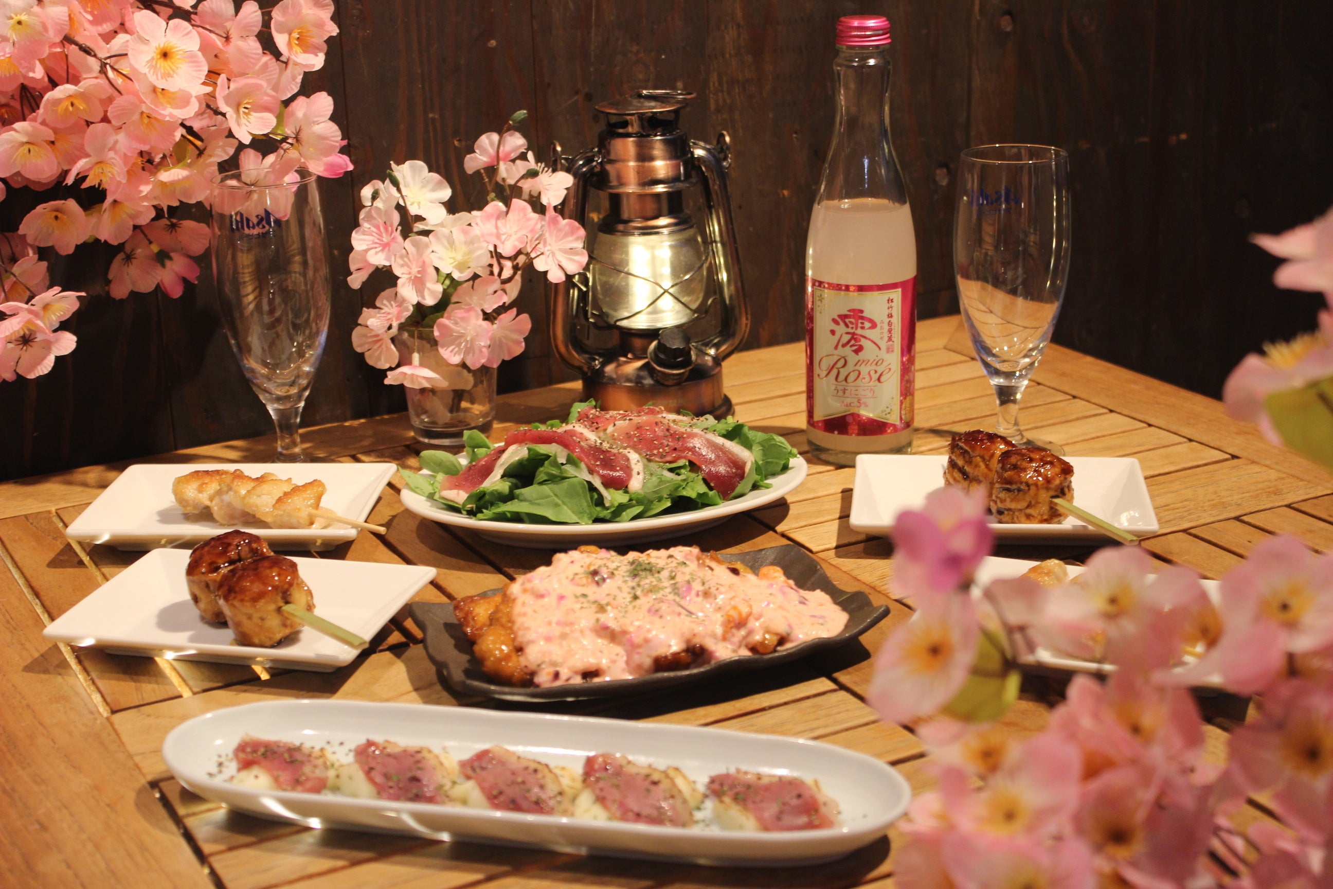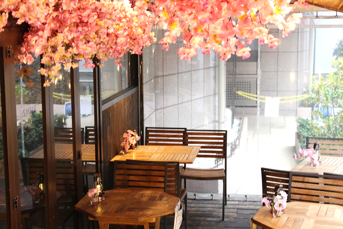 - もっと春のお祝い気分を満喫できるテラスで花見焼き鳥。