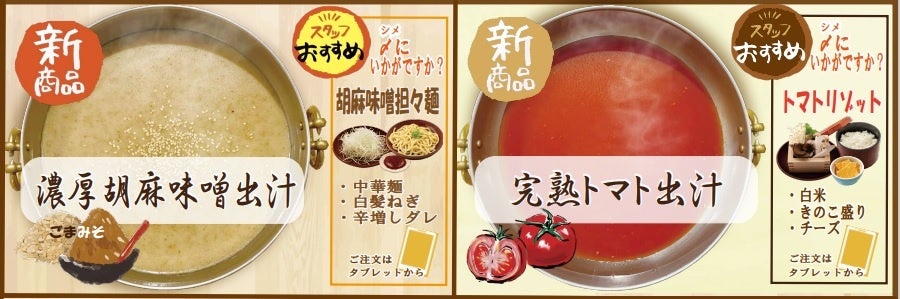 3月22日(火)から新たな出汁がグランドメニューに仲間入りします!“濃厚胡麻味噌出汁”“完熟トマト出汁”の2種類が登場し、全10種類のお出汁から選べるようになりました。