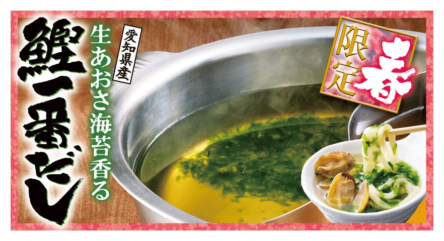 鰹だしの〆は、生あおさ海苔うどんがおすすめ! 最初から最後まで、あおさと鰹が楽しめる春期間限定だしをぜひご賞味ください。