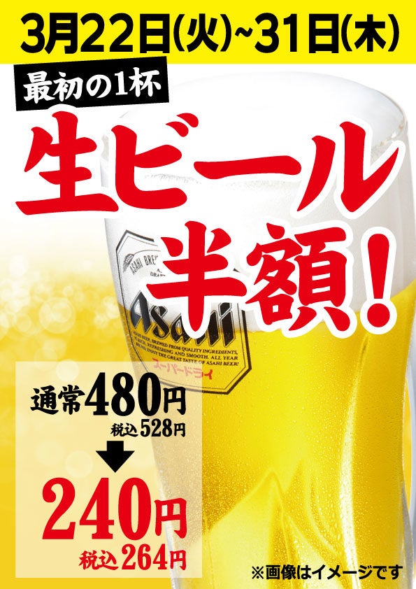 3月11日開催の「餃子単品半額、餃子定食100円引きフェア」に引き続き、今週3月22日からは「生ビール最初の1杯半額フェア」が始まります。