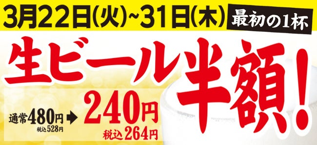 京都北白川ラーメン魁力屋をチェーン展開する株式会社魁力屋、(http://www.kairikiya.co.jp本社:京都市中京区、代表取締役社長:藤田 宗、以下魁力屋)は、2022年3月22日(火)より、期間限定「生ビール最初の1杯半額フェア」を実施いたします。