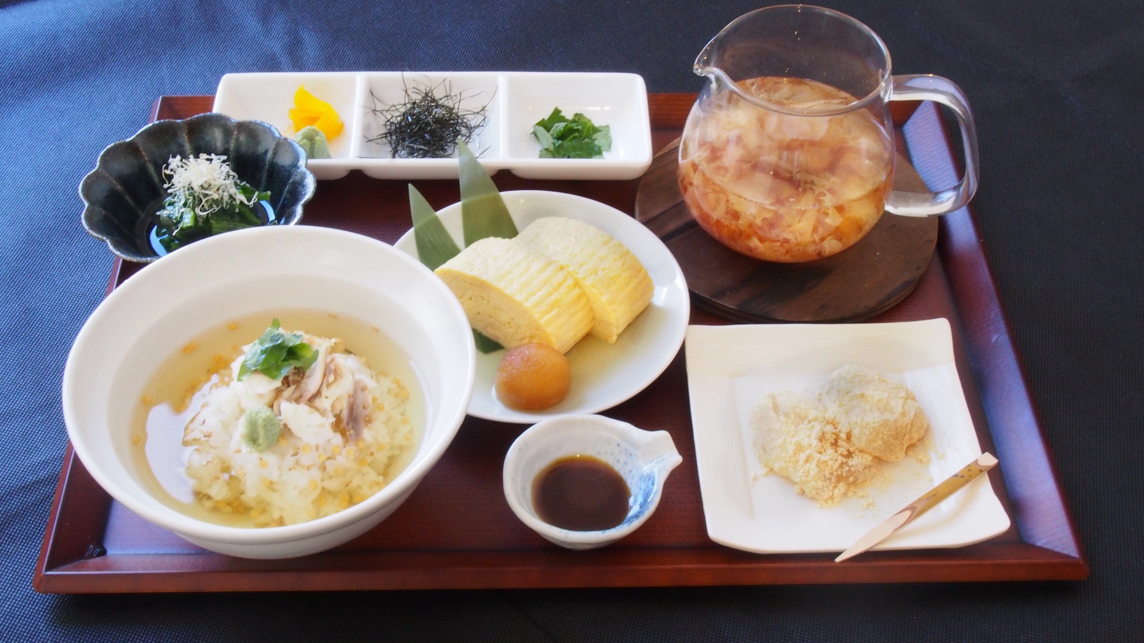 まずは鯛そぼろご飯だけを美味しく召し上がっていただいたあとに、かつお香るお出汁でお茶漬けとしてもお召し上がりいただけます。薬味を加えて味変もお楽しみください。人気の巻き出汁とわらび餅がついたお得な定食となっています。