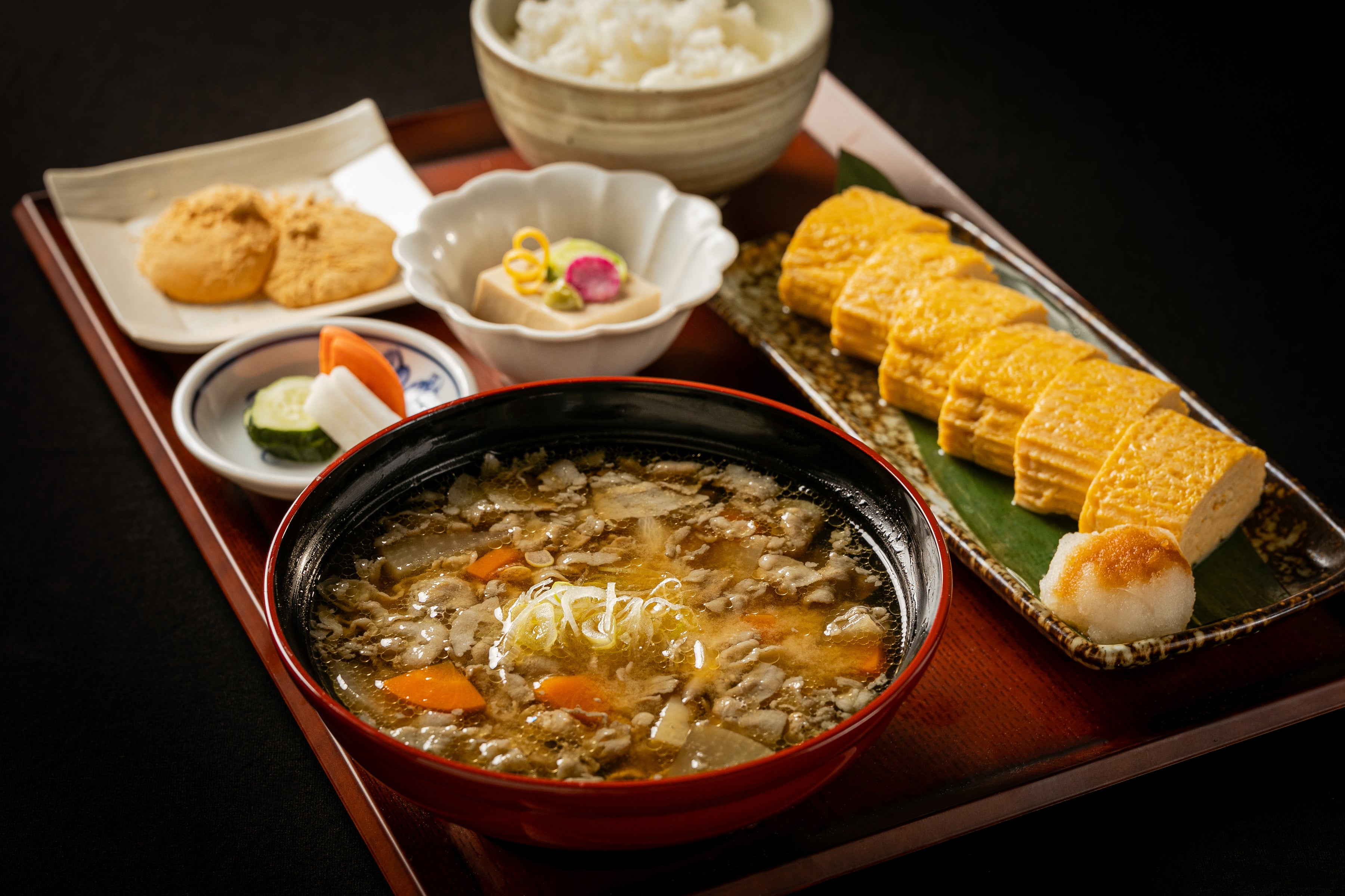 しゃぶしゃぶ芭舞一番人気のランチメニューです。まるで出汁で卵を巻いている様なふわっふわの巻き出汁と、具沢山で味わい深い豚汁がセットになっています。デザートには、丁寧に作り上げた本格わらび餅がついています。