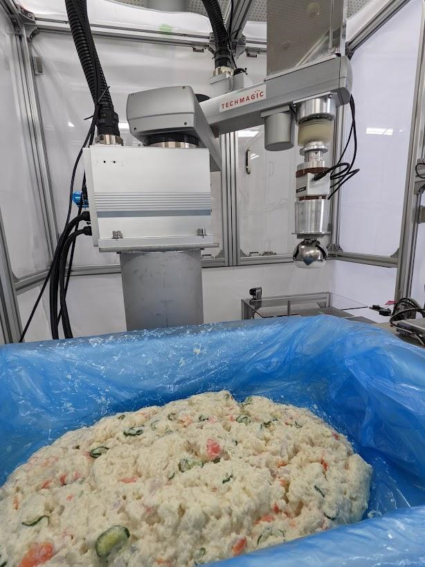 TechMagic株式会社(本社:東京都江東区、代表取締役社長:白木裕士、以下 「TechMagic」)は、ポテトサラダのような不定形かつ粘着性の高い惣菜を、高い重量精度で連続的に容器に盛り付けることが可能なロボットの実現に成功しました。惣菜、弁当工場の人手不足解消に向けて、商品性や採算性を高めるためのさらなる技術開発を進めてまいります。