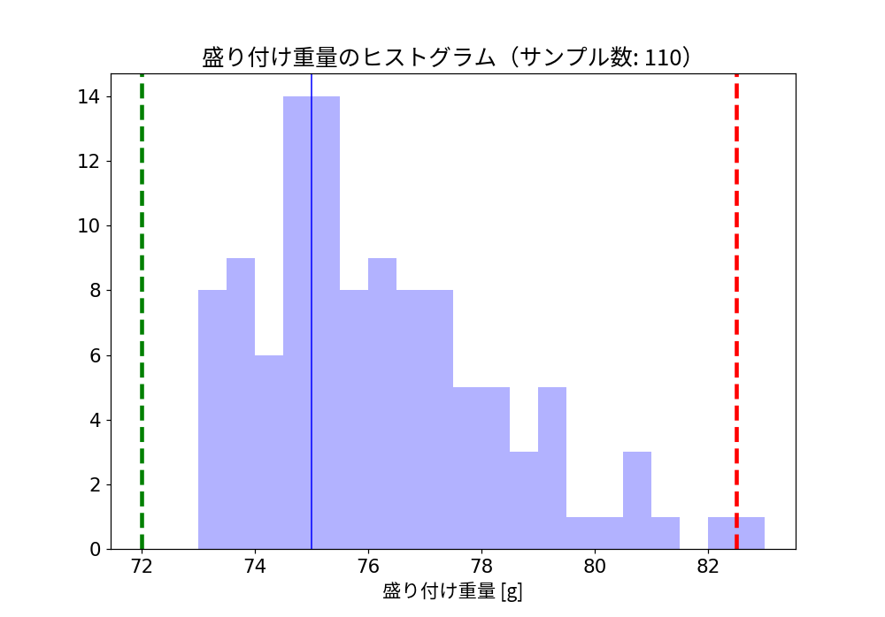 以下にロボットが盛りつけたポテトサラダの重量の分布を示します。75gの目標重量に対し、下限が72g(-4%), 上限が82.5g(+10%)であることが計量法では定められています。実験結果は、99%のサンプルが計量法範囲内の重量となり、高い重量精度でポテトサラダを自動で盛り付けることができました。