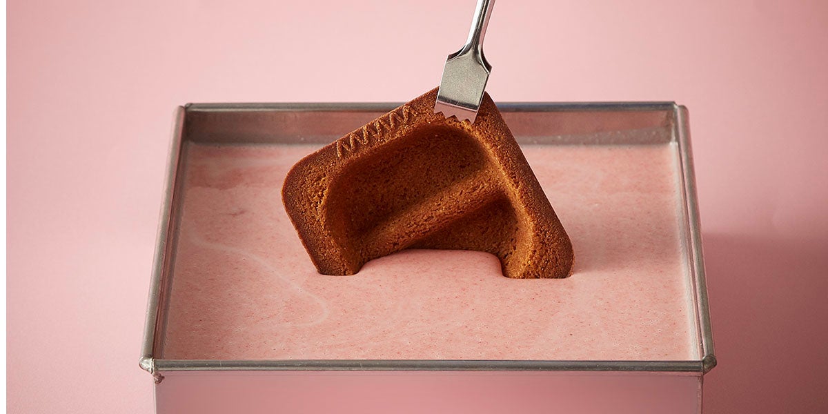 チーズムースに苺ペーストを混ぜ、クッキーには苺チョコレートをコーティング。ムースとスフレの間には果肉感のある自家製苺ジャムを入れ込み、さらに上から苺パウダーをかけたアンバランスなイチゴづくし