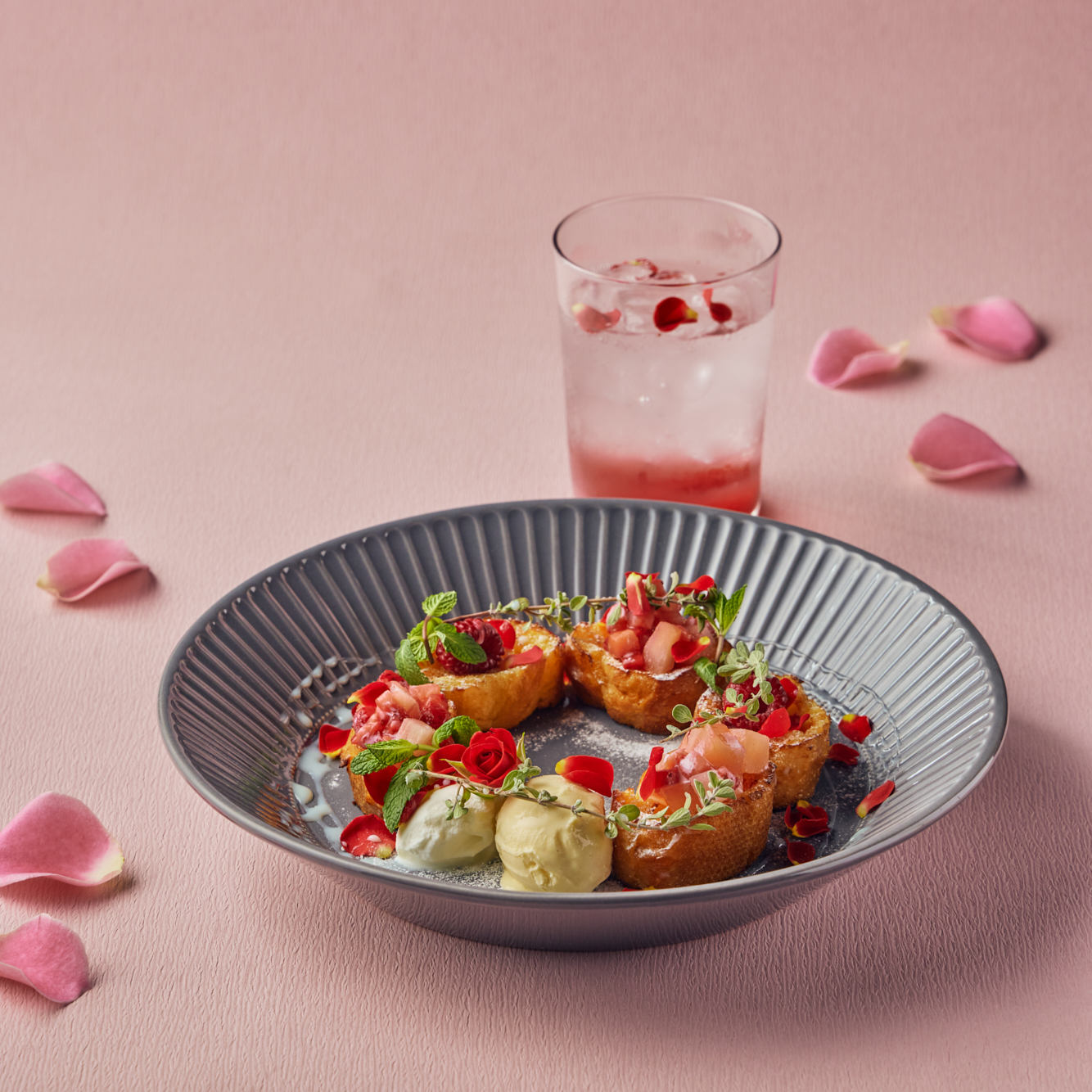 バラをあしらった花かんむりのフレンチトーストとバラと苺のソーダをセットで提供します。