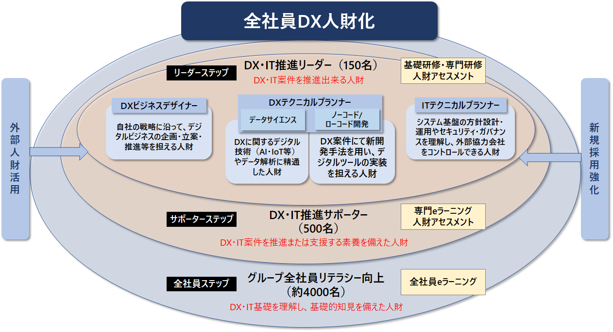 このプログラムは、「全社員ステップ」「サポーターステップ」「リーダーステップ」の3段階に分かれていて、株式会社エクサウィザーズ(注2)およびインソースグループ(注3)の教育プログラムを活用しながら、公募やアセスメントを経てDX・IT案件を推進できる人財を育成していきます。2023年までの「全社員ステップ」ではeラーニングを通じて「全社員DX人財化」の基盤をつくり、その後「サポーターステップ」「リーダーステップ」で500名規模のDX・IT推進サポーター、および150名規模のDX・IT推進リーダーを育成し、グループ全体の戦略推進力の向上を図ります。また、2024年以降は社内で自走的に人財育成ができる体制を構築します。