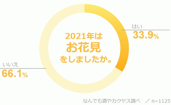 三度目となるコロナ禍でのお花見を、カクヤスユーザーたちはどうとらえているのでしょうか。まず、2021年はお花見をしたかどうかを聞いてみたところ、「はい」は34%、「いいえ」は66%でした。2021年3月下旬からの約1カ月間は緊急事態宣言が解除されましたが、お花見を断念した人は多かったようです。