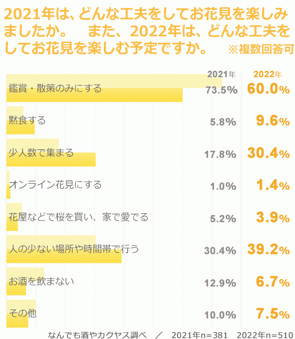 ユニークなところでは、「桜のミニ盆栽を愛でながら家族で宴会」、「桜系のお酒を家で飲む」、「三回目のワクチンが終わったメンバーのみで行う」などが挙げられました。「2022年も一人で行きます!」という一人お花見派もちらほら。コロナ禍をきっかけに、おひとりさまを堂々と楽しむ人が増えたと推測できます。