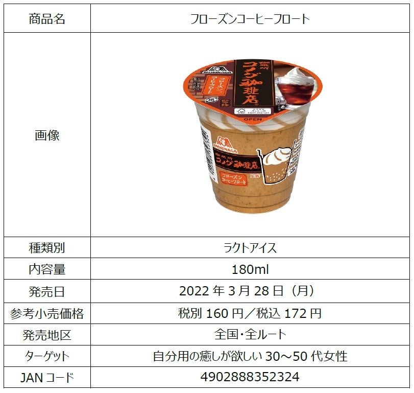 森永製菓株式会社(東京都港区芝、代表取締役社長・太田 栄二郎)は、株式会社コメダ(愛知県名古屋市、代表取締役社長・臼井 興胤)が運営するフルサービス型の喫茶店「コメダ珈琲店」が監修したデザートアイス「フローズンコーヒーフロート」を2022年3月28日(月)より新発売いたします。