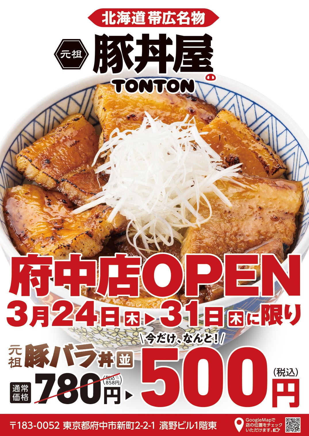 府中店オープンを記念して、3/24(木)〜31(木)に限り、当店自慢の「豚バラ丼〈並〉」を特別価格500円(税込)にて提供いたします。