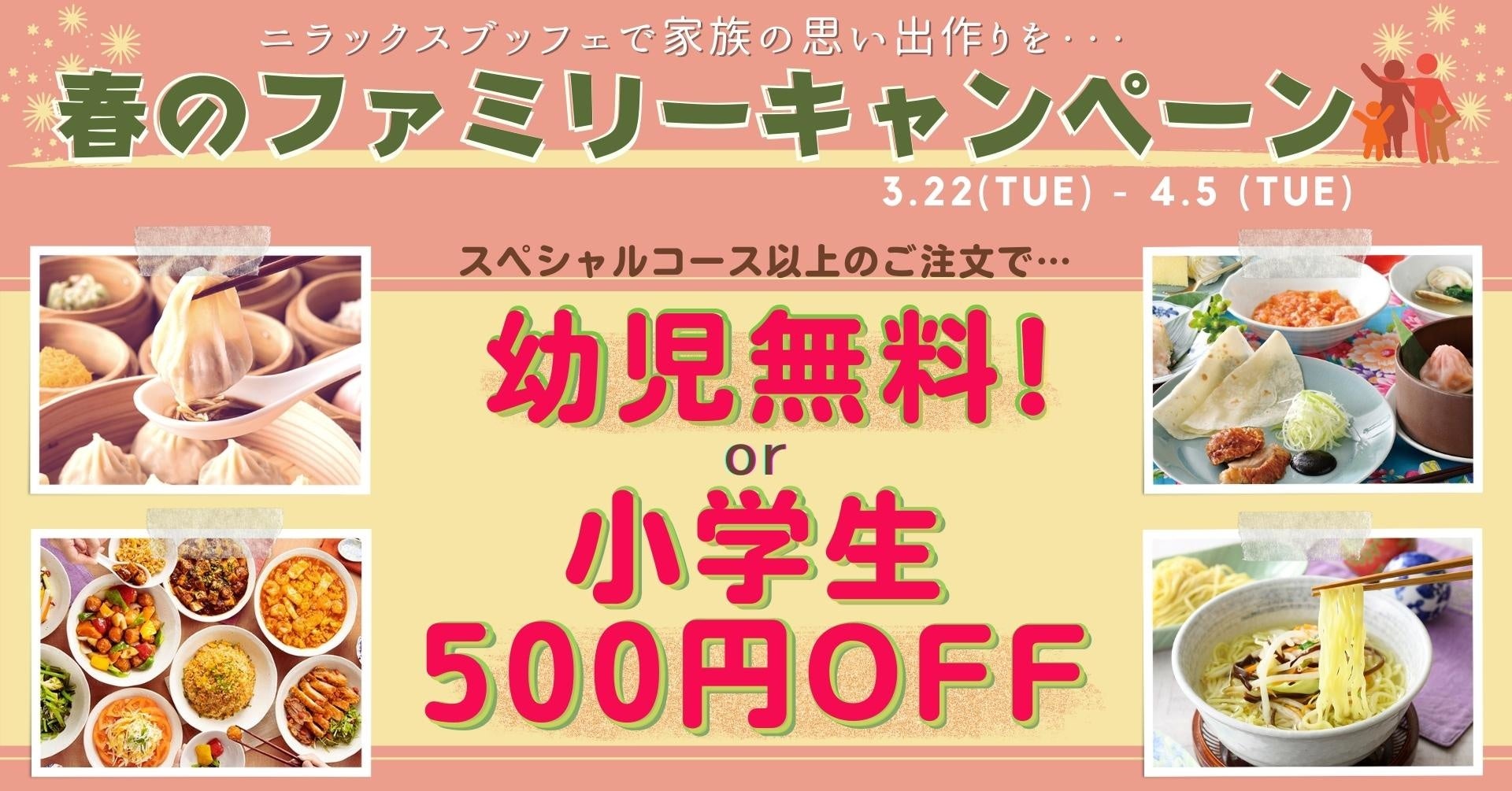 食べ放題のテーマパーク、 ニラックス株式会社(本社:東京都武蔵野市、 代表取締役:崎田 晴義)が運営するブッフェレストラン「ザブッフェ包包點心」と「ザブッフェ點心甜心」にて、スペシャルコース / プレミアムコースの方限定『幼児料金無料』または『小学生料金500円OFF』でご利用いただける『春のファミリーキャンペーン』を開催いたします!