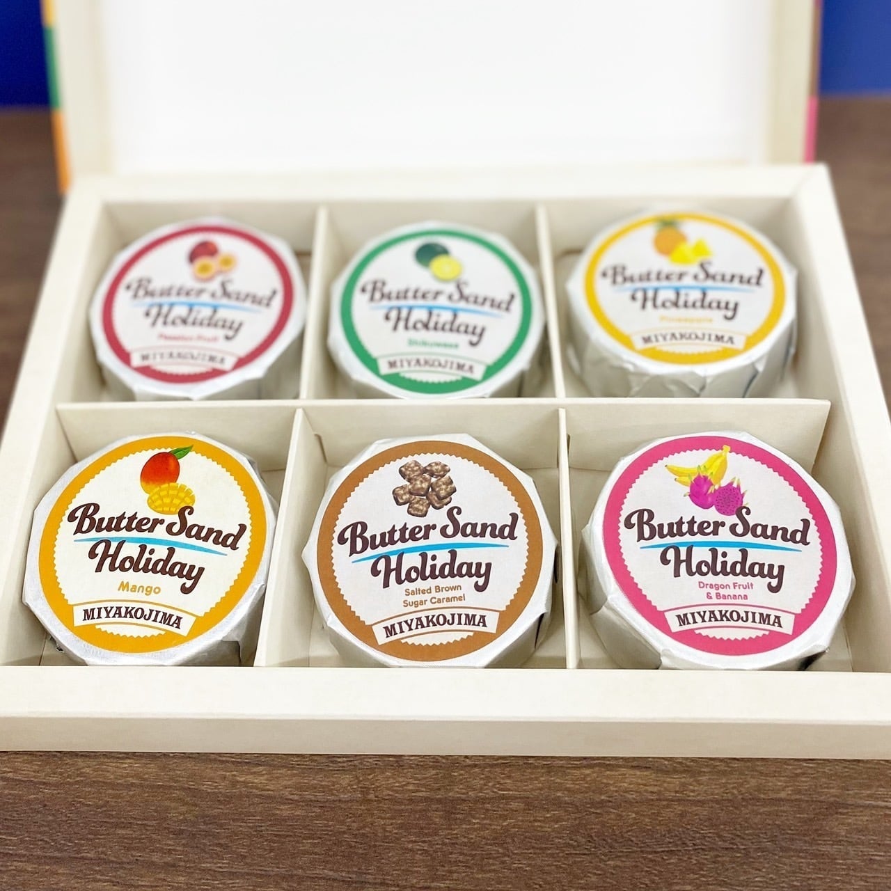 宮古島の豊富なフルーツや黒糖を純バターと合わせ、しっとり香ばしいサブレでサンド。フルーツ本来の香りや美味しさが味わえる全て手作りの贅沢なバターサンドです。マンゴー、シークヮーサー、パイナップル、パッションフルーツ、黒糖塩キャラメル、ドラゴンフルーツ&バナナを各種1個ずつ詰め合わせ。島内で一つ一つ丁寧に手作り。宮古島の風景、気候、香りなどを存分にお楽しみください。