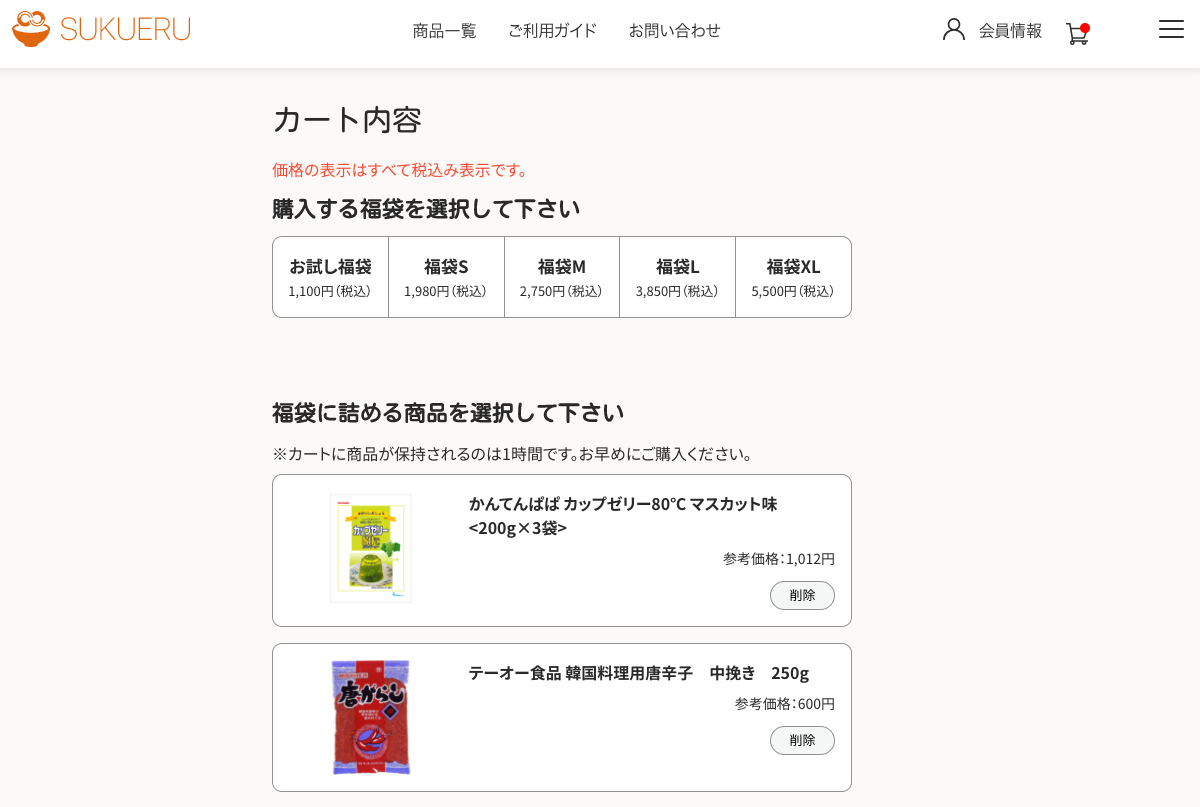 おためし福袋(1,100円)・福袋S(1,980円)・福袋M(2,750円)・福袋L(3,850円)・福袋XL(5,500円)