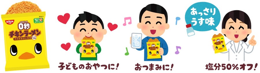 麺に味が付いている「チキンラーメン」だからこそできた「0秒チキンラーメン」を、お子さまのおやつやお酒のおつまみに、ぜひお試しください。