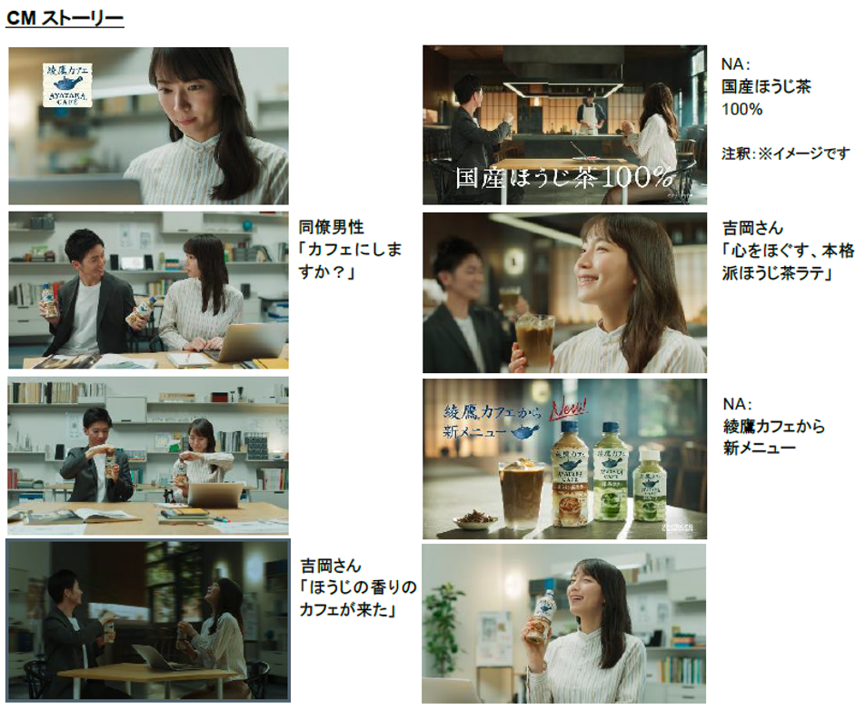 吉岡里帆さんが、オフィスで仕事に一区切りつけるシーンから始まります。同僚の「カフェにしますか」の一言で「綾鷹カフェ ほうじ茶ラテ」のボトルをあける吉岡さん。すると場面はオフィスからカフェへ早変わり。「ほうじの香りのカフェが来た」と笑みがこぼれる吉岡さん。「心をほぐす本格派ほうじ茶ラテ」と一言語り、「ほうじ茶ラテ」を飲むカフェから、元のオフィスに戻りホッと一息つく吉岡さんの姿で締めくくります。