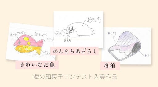 コンテストには30作品の応募があり、選ばれたアイデアは、卓越した和菓子職人の技によって生菓子に再現されました。色鮮やかな練り切りに金箔をあしらった「きれいなお魚」、あんこを牛皮で包んだユーモラスな「あんもちあざらし」、冬の日本海の波打ち際を表現した「冬浪」の3作品です。