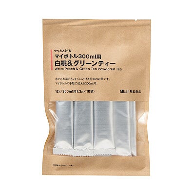 お茶の定番「緑茶」、爽やかな風味が特徴な「マスカット&グリーンルイボス」、「白桃&グリーンティー」の3アイテムを新たに発売します。無印良品の「自分で詰める水のボトル」や、お気に入りのマイボトルで利用いただき、水でサッと溶かして、手軽に冷たい飲み物を作ることができます。