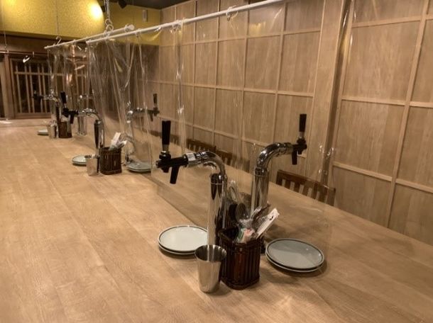 また、先斗町酒場では、新型コロナウイルス感染拡大防止の取り組みを行っております。具体的には、店内換気や店内消毒はもちろんのこと、スタッフの健康管理やこまめな手洗い消毒、マスク着用を徹底しております。また、ソーシャルディスタンスを保つため大テーブル席はビニールシートで仕切るなど、身体的距離の確保に努めております。