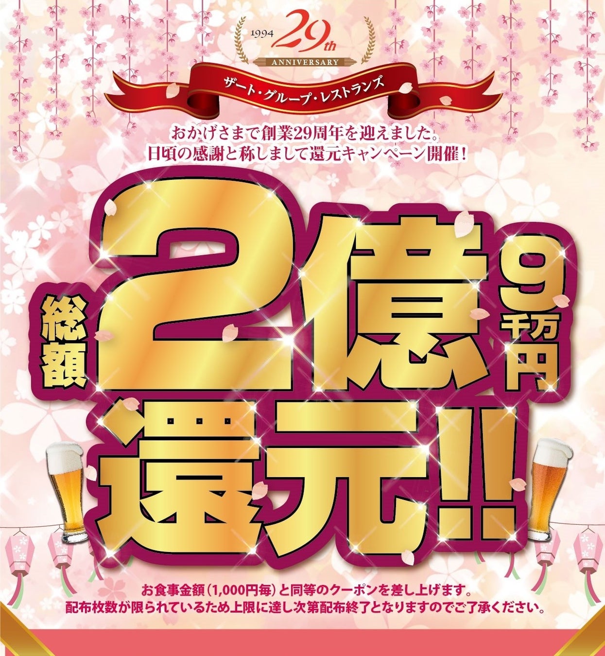 ザートグループレストランでお食事いただいた金額(1,000円毎)と同等のクーポンを差し上げます。クーポンは次回ご来店時、お食事金額が3,000円(税抜)毎に1枚(1,000円割引)ご利用可能です。クーポンはご利用店舗のLINE公式アカウント友だち登録者様限定でご利用可能です。新たに公式LINE友だち登録してくれたお客様も配布対象となりますので、この機会にぜひ!