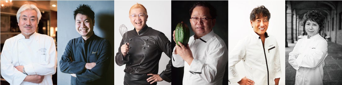 写真左から、三枝 俊介 (CHOCOLATIER PALET D’OR)、吉野 慶一(dari K)、辻口 博啓(LE CHOCOLAT DE H)、土屋 公二(Musée Du Chocolat Théobroma)、小山 進(PATISSIER eS KOYAMA)、才村 由美子(Yumiko SAIMURA)