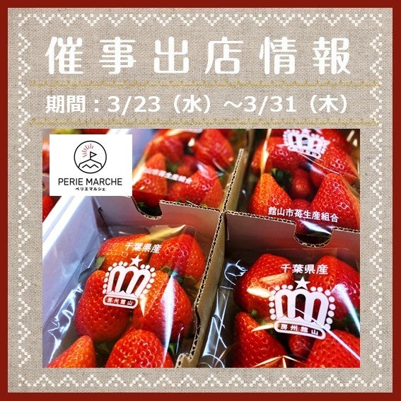 「毎日欲しいものが見つかるペリエ」をコンセプトに掲げるペリエ西船橋(所在地:千葉県船橋市西船4丁目27-7、運営会社:株式会社千葉ステーションビル)は、ペリエ西船橋改札内2F(JR西船橋駅構内)の催事場にて、館山産の「とちおとめ」「やよいひめ」など「千葉県産のいちご」を販売する期間限定催事『ペリエマルシェいちご祭り』を、2022年3月23日(水)~3月31日(木)に開催いたします。