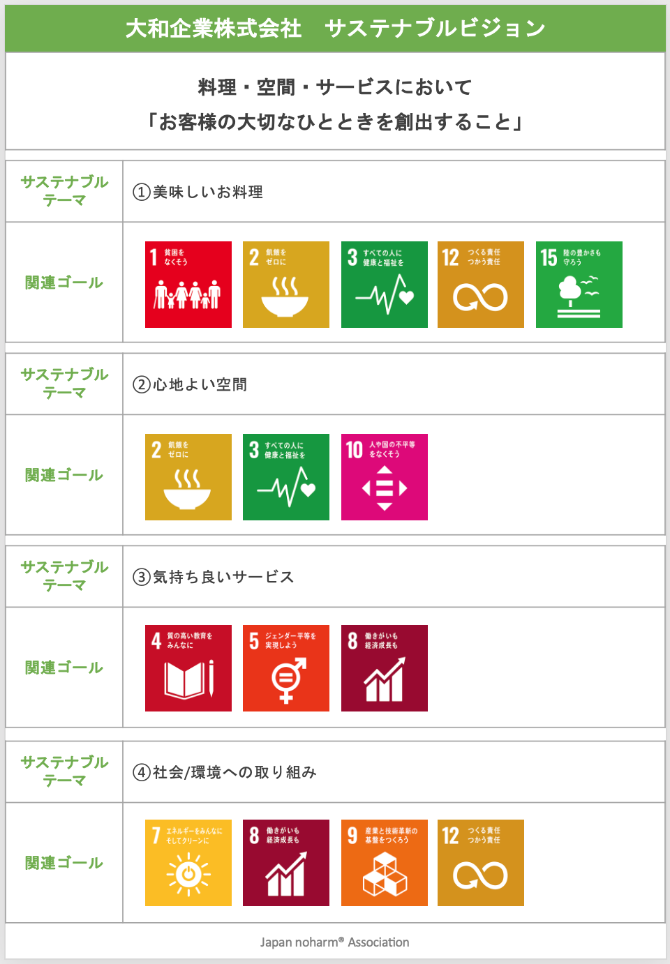 大和企業株式会社 (所在地:大阪市 代表取締役社長:國次孝平)は、SDGsに取り組む企業を対象としたサステナブル経営支援サービスを提供する一般社団法人日本ノハム協会(代表理事:神田尚子) とメンバーシップを締結し、料理・空間・サービスにおいて 「お客様の大切なひとときを創出すること」をサステナブルビジョンに掲げ、SDGs を推進しています。