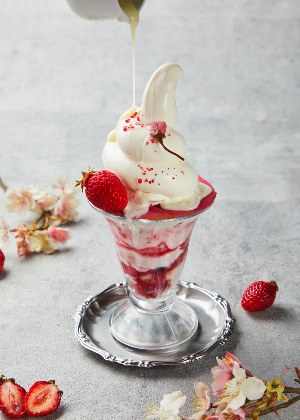 “MILK”の生クリームを贅沢に使用したとてもシルキーなソフトクリームパフェに完熟いちごをあしらった一品。春を感じていただけるオリジナルパフェに仕上げました。