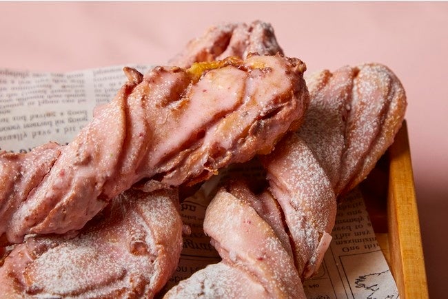 ジュワッと甘い、ナッツ生地の揚げパンにパリパリの苺チョコのコーティング