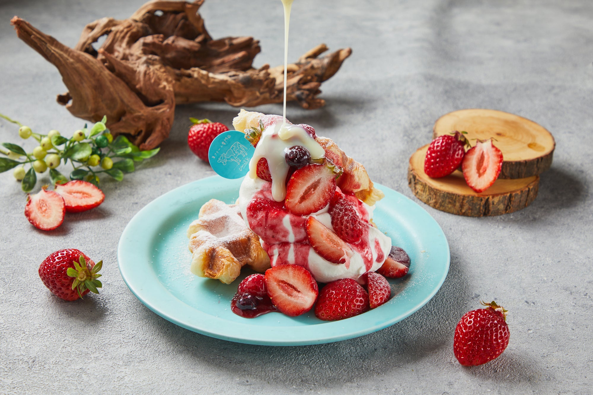 クロッフルに”MILK”の究極の生クリームを使用した一品。贅沢に完熟いちごをトッピングしてお好みで練乳で味変もお楽しみにいただけます。
