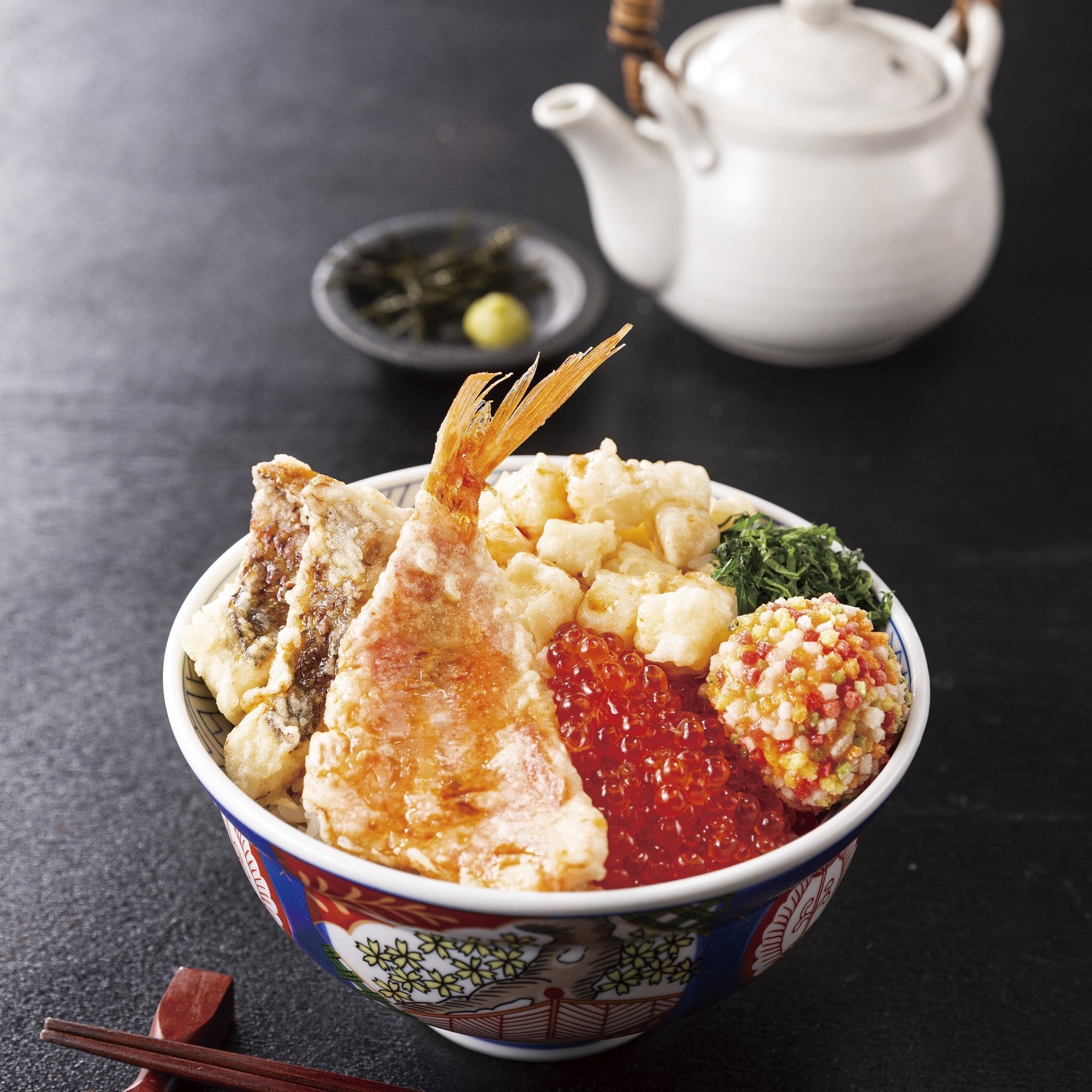 金目鯛と真鯛の天ぷらに、烏賊と貝柱のかき揚げや五色あられの海老しんじょう天、さらに、いくらと千切りの大葉を盛りつけた春らしく彩り鮮やかな「金目鯛と真鯛の春天丼」は、鯛出汁を注いで鯛茶漬けとして一度で二度おいしいご馳走天丼です。