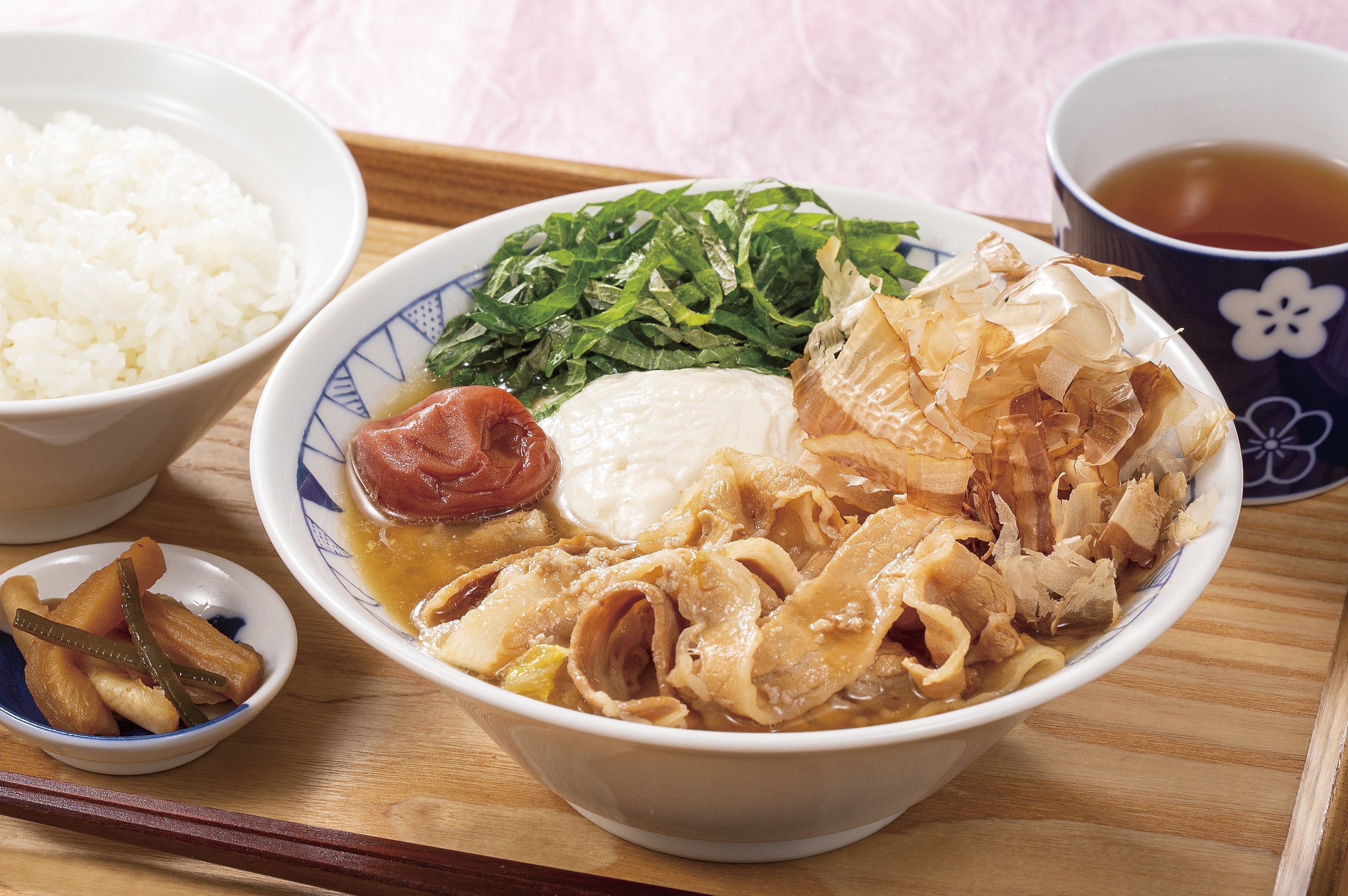 春らしくさっぱりとしつつ食べ応えのある「梅かつお豚汁定食」が期間限定で新登場。たっぶりの豚肉に、紀州南高梅、しそ、鰹節を盛りつけた朝晩の気温差があるこの時期に嬉しい身体の芯から温まる一品です。